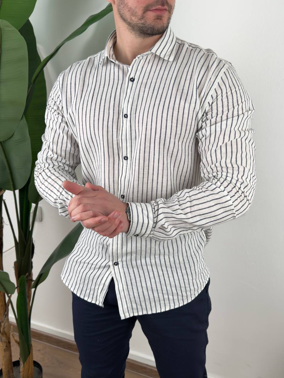Laneno pamučna košulja sa prugama, regular slim kalupa.