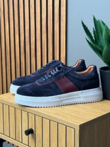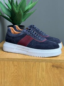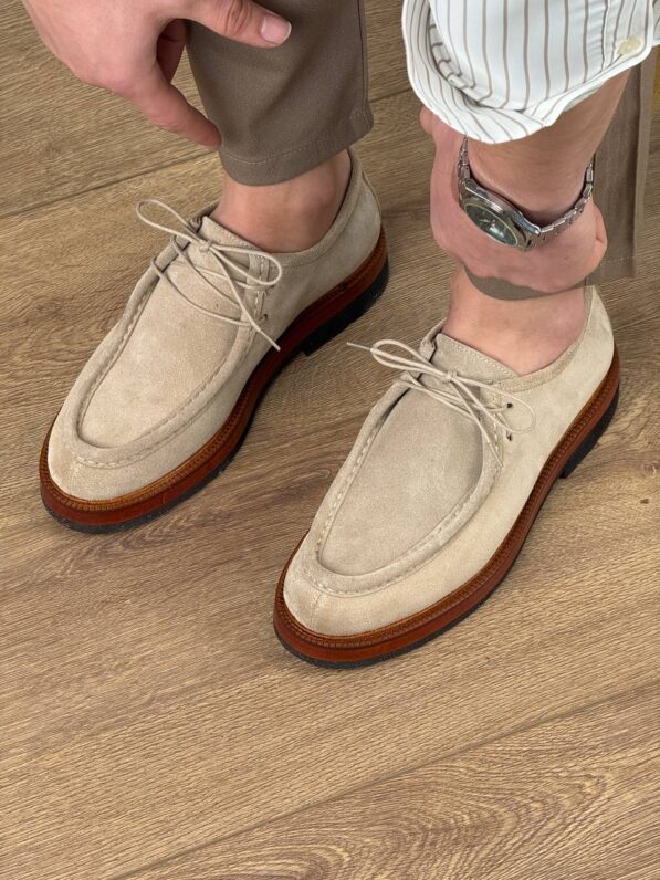 Masivni đon u toploj terakota nijansi pravi kontrast uz gornji deo u neutralnim bojama – bež, lešnik, braon, crna. Jednostavni vezovi i zaobljeni nos drže silhuetu čistom i bez suvišnih detalja.